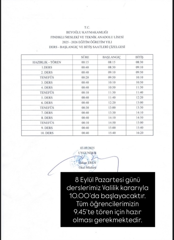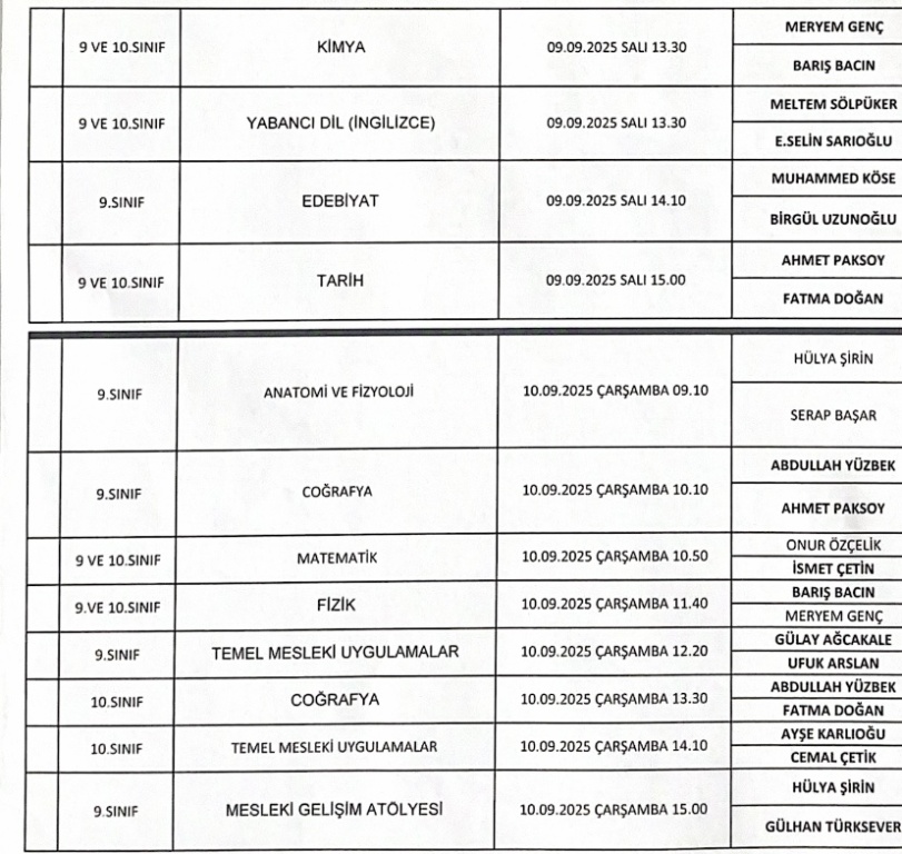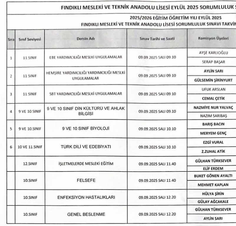 2025/2026 Eğitim Öğretim Yılı Eylül Ayı Sorumluluk Sınavları