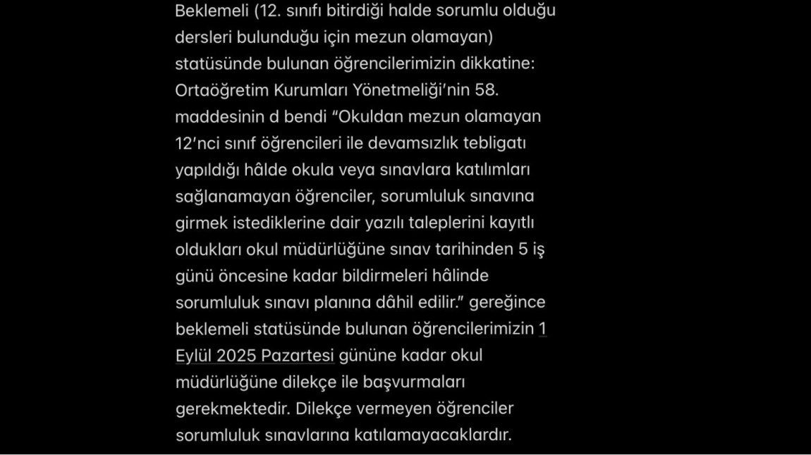 2025/2026 Eğitim Öğretim Yılı Eylül Ayı Sorumluluk Sınavları